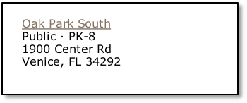 Venice Elementary School Public · K-5  150 Miami Ave E  Venice, FL 34285 ELEMENTARY SCHOOLS Garden Elementary School Public · K-5  700 Center Rd  Venice, FL 34285 Taylor Ranch Elementary School Public · PK-5  2500 Taylor Ranch Trl  Venice, FL 34293 Island Village Montessori School Charter · K-8  2001 Pinebrook Rd  Venice, FL 34292 Oak Park South Public · PK-8 1900 Center Rd Venice, FL 34292 Epiphany Cathedral School Private · PK-8 316 Sarasota Street Venice, FL 34285 Venice SDA Christian Elementary School Private · 1-6  2375 S Seaboard Ave  Venice, FL 34293 International Montessori Academy Private · PK-6 1975 S. Tamiami Trail Venice, FL 34293 The Study Center Private · n/a  1501 Tamiami Trl S # 501  Venice, FL 34285 Auburn Road Presbyterian Academy Private · 3-12  642 N Auburn Road  Venice, FL 34292 MIDDLE SCHOOLS Venice Middle School Public · 6-8  1900 Center Rd  Venice, FL 34292 Student Leadership Academy Charter · 6-8  200 Field Ave E  Venice, FL 34285 Sky Academy Charter · 8-9  701 Center Rd  Venice, FL 34285 Island Village Montessori School Charter · K-8  2001 Pinebrook Rd  Venice, FL 34292 Oak Park South Public · PK-8 1900 Center Rd Venice, FL 34292 Epiphany Cathedral School Private · PK-8 316 Sarasota Street Venice, FL 34285 The Study Center Private · n/a  1501 Tamiami Trl S # 501  Venice, FL 34285 Auburn Road Presbyterian Academy Private · 3-12  642 N Auburn Road  Venice, FL 34292 HIGH SCHOOLS The Study Center Private · n/a  1501 Tamiami Trl S # 501  Venice, FL 34285 Auburn Road Presbyterian Academy Private · 3-12  642 N Auburn Road  Venice, FL 34292 Venice Senior High School Public · 9-12  1 Indian Ave  Venice, FL 34285 PUBLIC SCHOOLS Venice Elementary School Public · K-5  150 Miami Ave E  Venice, FL 34285 Garden Elementary School Public · K-5  700 Center Rd  Venice, FL 34285 Taylor Ranch Elementary School Public · PK-5  2500 Taylor Ranch Trl  Venice, FL 34293 Venice Middle School Public · 6-8  1900 Center Rd  Venice, FL 34292 Sky Academy Charter · 8-9  701 Center Rd  Venice, FL 34285 Student Leadership Academy Charter · 6-8  200 Field Ave E  Venice, FL 34285 Venice Senior High School Public · 9-12  1 Indian Ave  Venice, FL 34285 Island Village Montessori School Charter · K-8  2001 Pinebrook Rd  Venice, FL 34292 Oak Park South Public · PK-8 1900 Center Rd Venice, FL 34292 PRIVATE SCHOOLS Epiphany Cathedral School Private · PK-8 316 Sarasota Street Venice, FL 34285 Venice Christian School Private · Preschool  1200 Center Rd  Venice, FL 34292 Venice SDA Christian Elementary School Private · 1-6  2375 S Seaboard Ave  Venice, FL 34293 International Montessori Academy Private · PK-6 1975 S. Tamiami Trail Venice, FL 34293 The Study Center Private · n/a  1501 Tamiami Trl S # 501  Venice, FL 34285 Auburn Road Presbyterian Academy Private · 3-12  642 N Auburn Road  Venice, FL 34292 Early Childhood Center Private · Preschool 111 Firenze Ave E Venice, FL 34285 Christ United Methodist Dev Center Private · Preschool  1475 Center Rd  Venice, FL 34292 Children First HD St.-Venice Private · Preschool 157 S Havava Rd Venice, FL 34292 Children First HS-Loveland Private · Preschool 157 Havanna Rd Venice, FL 34292 Academy of Creative Learning Private · Preschool 1602 Banyan Dr Venice, FL 34293 Lakeside Pre-School Private · Preschool 2401 Tamiami Trl S Venice, FL 34293 Shamrock Pre-School Private · Preschool 3064 Shamrock Dr Venice, FL 34293 Island Village Montessori Preschool Private · Preschool 3975 Village N Mont Sc Venice, FL 34292 Grace United Methodist Pre-School Private · Preschool 400 Field Ave E Venice, FL 34285 St. Mark's Pre-School Private · Preschool 508 Riviera St Venice, FL 34285 Happy Hearts Early Learning Center Private · Preschool 620 Shamrock Blvd Venice, FL 34293 Florida Child Development Center Private · Preschool 800 Gulf Coast Blvd Venice, FL 34285 CHARTER SCHOOLS Sky Academy Charter · 8-9  701 Center Rd  Venice, FL 34285 Student Leadership Academy Charter · 6-8  200 Field Ave E  Venice, FL 34285 Island Village Montessori School Charter · K-8  2001 Pinebrook Rd  Venice, FL 34292
